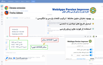Jira Persian Improver는 페르시아어 사용자들을 위한 Jira의 사용성을 향상시키기 위해 설계된 Firefox 확장 프로그램입니다. 이 구독 기반 도구는 혼합 텍스트에 대한 개선된 표시, 그레고리력 날짜를 잘라리력 날짜로 변환, 아름다운 페르시아 글꼴 사용과 같은 기능을 제공합니다. 또한, 페르시아 달력에 익숙한 사용자들을 위한 날짜 선택을 간소화하는 잘라리 날짜 선택기가 포함되어 있습니다.